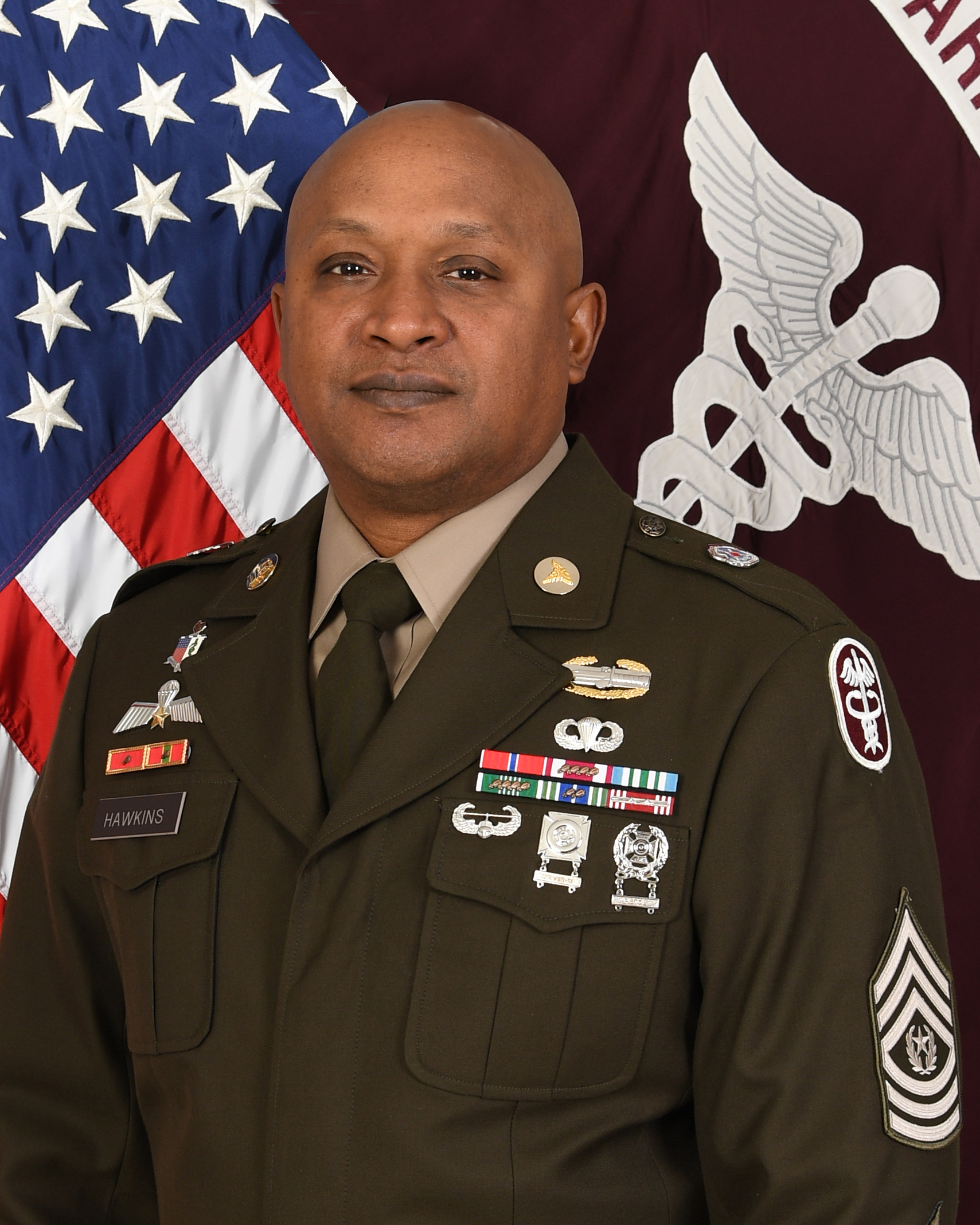 CSM Hawkins’ previous assignments include Licensed Vocational Nurse, William Beaumont Army Medical Center, Fort Bliss, Texas; Education and Training NCOIC, 121st Combat Support Hospital, Seoul, South Korea; Plans and Operations NCO, 261st Multifunctional Medical Battalion, Fort Bragg, North Carolina; Detachment Sergeant, 274th Forward Surgical Team (Airborne), Fort Bragg, North Carolina; Operations NCOIC, 28th Combat Support Hospital, Fort Bragg, North Carolina; Deputy NCOIC for Patient Services, Carl R. Darnall Army Medical Center, Fort Hood, Texas; First Sergeant, Headquarters and Headquarters Company, 1st Medical Brigade, Fort Hood, Texas; Troop Command Sergeant Major, Blanchfield Army Community Hospital, Fort Campbell, Kentucky; Chief Medical NCO, 1st Calvary Division, Fort Hood, Texas; Command Sergeant Major, 627th Hospital Center, Fort Carson, Colorado. Overseas assignment includes Seoul, South Korea, and deployments to Iraq with the 31st and 10th Combat Support Hospitals, and Syria with 274th Forward Surgical Team (ABN) for combat operations.