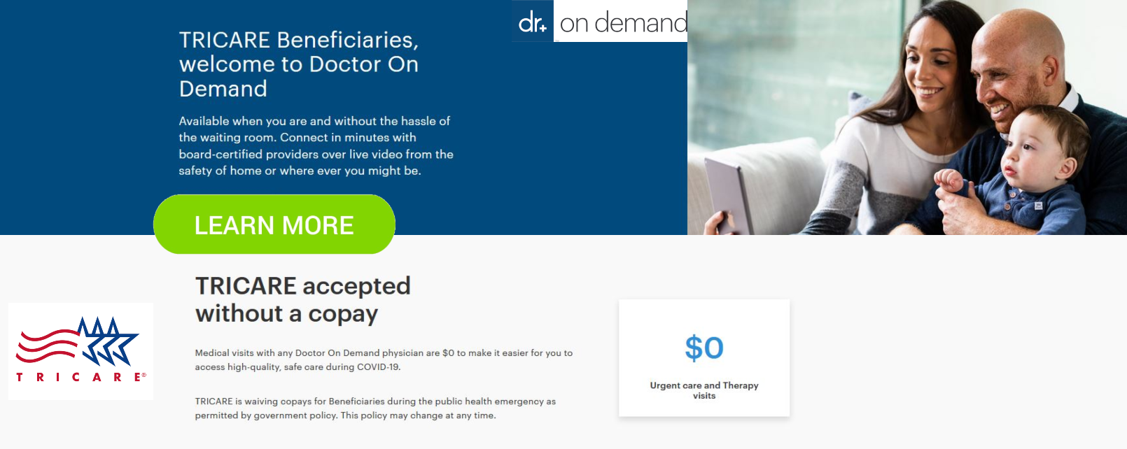 Humana Military has partnered with Doctor on Demand to offer TRICARE East Region beneficiaries increased access to telehealth services. Offering urgent care and mental health care (excluding psychiatry) services, connect face-to-face with providers through virtual appointments using Doctor On Demand by visiting https://doctorondemand.com/microsite/humanamilitary/.